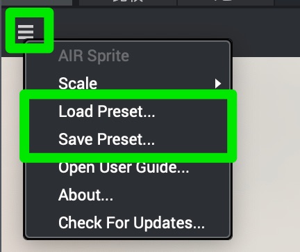 AIR Music Technologyのプラグインはプリセットの保存をメニューのボタンから行います。