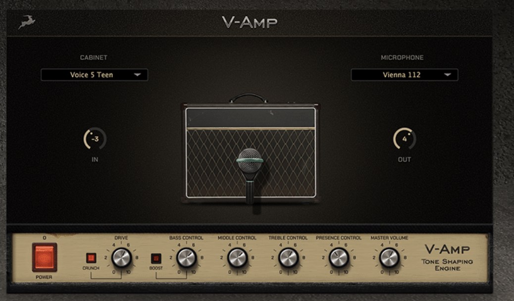 ここで重要なのが、前段にオーバードライブ・ペダル(DAW内蔵のものでOK)を噛ませてブーストすることです。V-AMP自体はそこまで超ハイゲインではありませんが、アナログアンプ同様、ブースターで入力を突っ込んでやることで、強烈な歪みを生み出します。この時、V-AMPの「Crunch」ノブを使って歪みの粒立ちを調整すると、ザクザクとした刻みに最適なエッジ感が得られます。