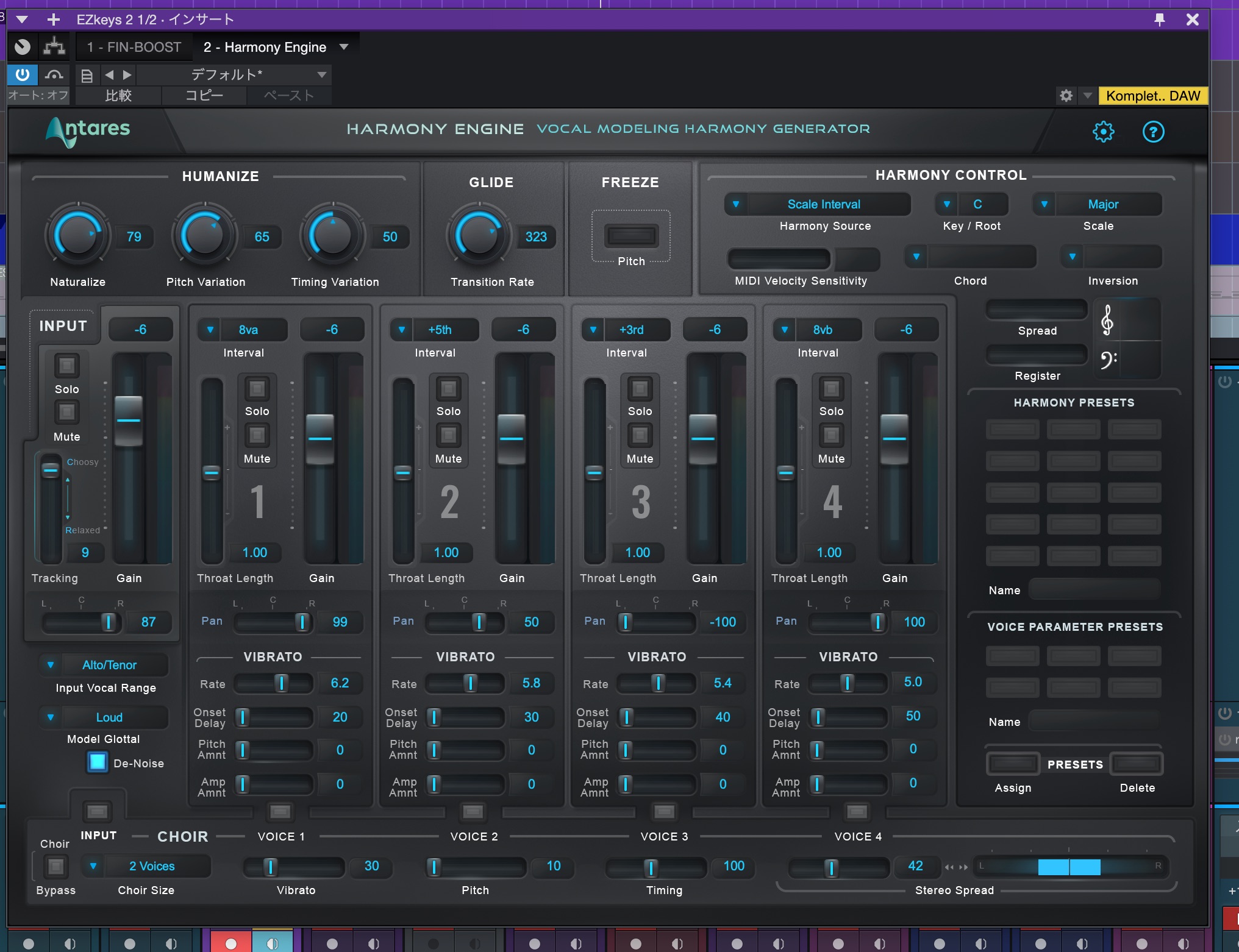 自動ハーモニー生成以外にも多人数で歌ったときのように再現するChoirスイッチ(コーラススイッチ),ビブラート・パンの個別調整などこう見えて多機能なプラグインです。。