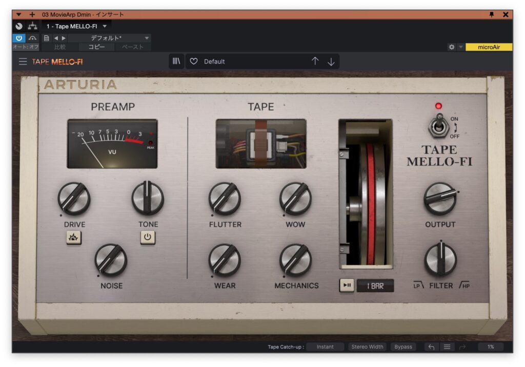 このTAPE MELLO-FIですがプラグインをONにしただけで、他のパラメーターを全くいじっていない状態でもちょっと劣化した雰囲気になるのが面白いです。