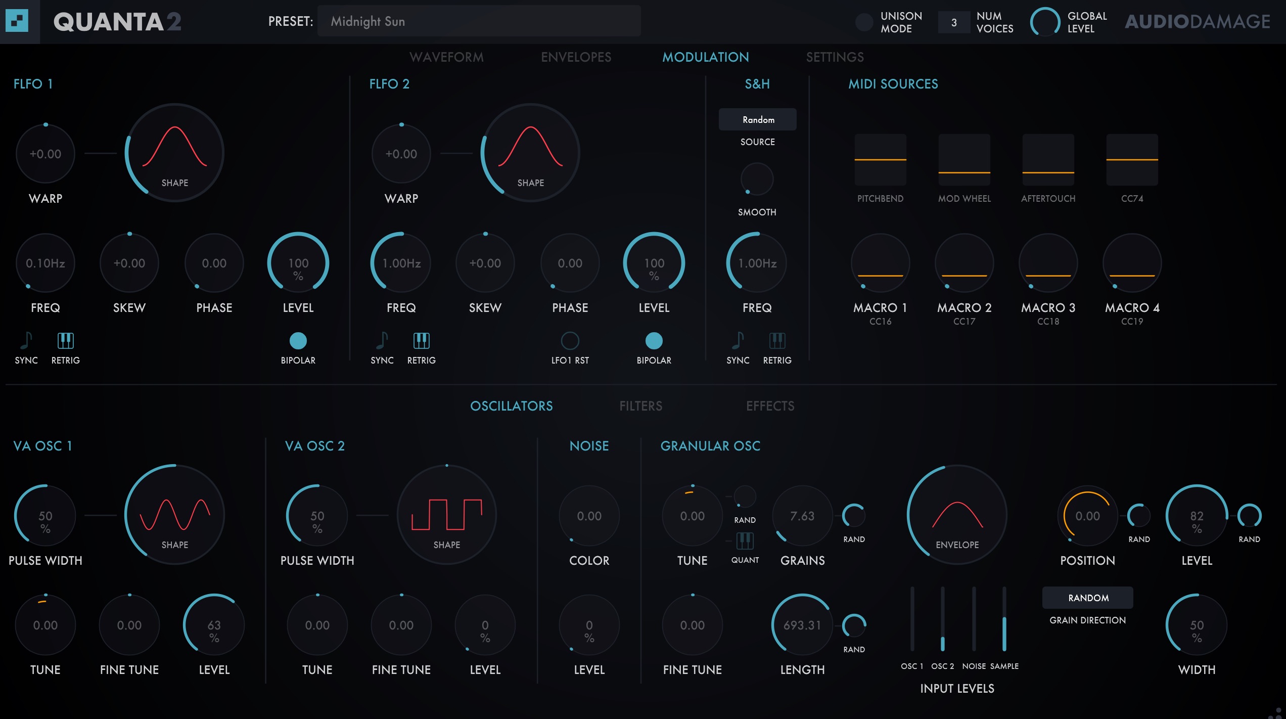 Quanta 2 オシレーター画面 左側にVAオシレーター、中央にNoise、右側にグラニュラーオシレーター