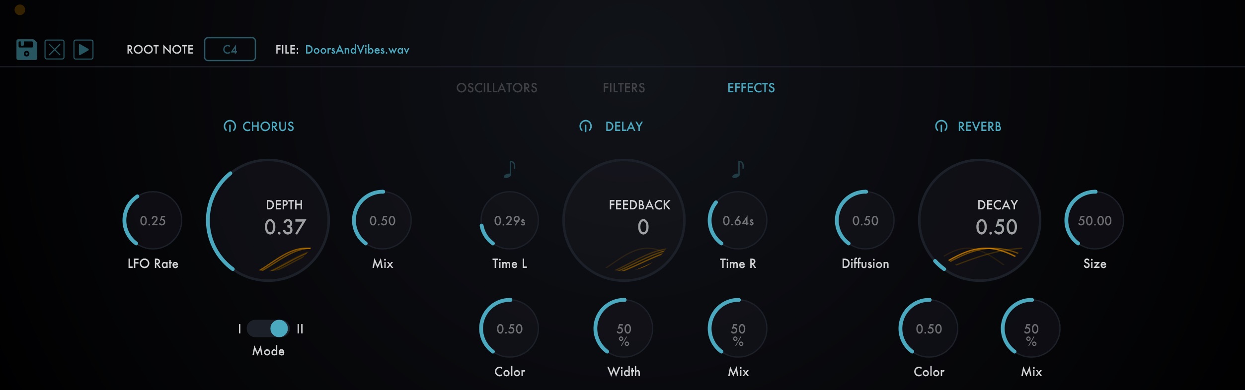 2つのフィルターとコーラス、ディレイ、リバーブの3つのエフェクトを使うことができます。
