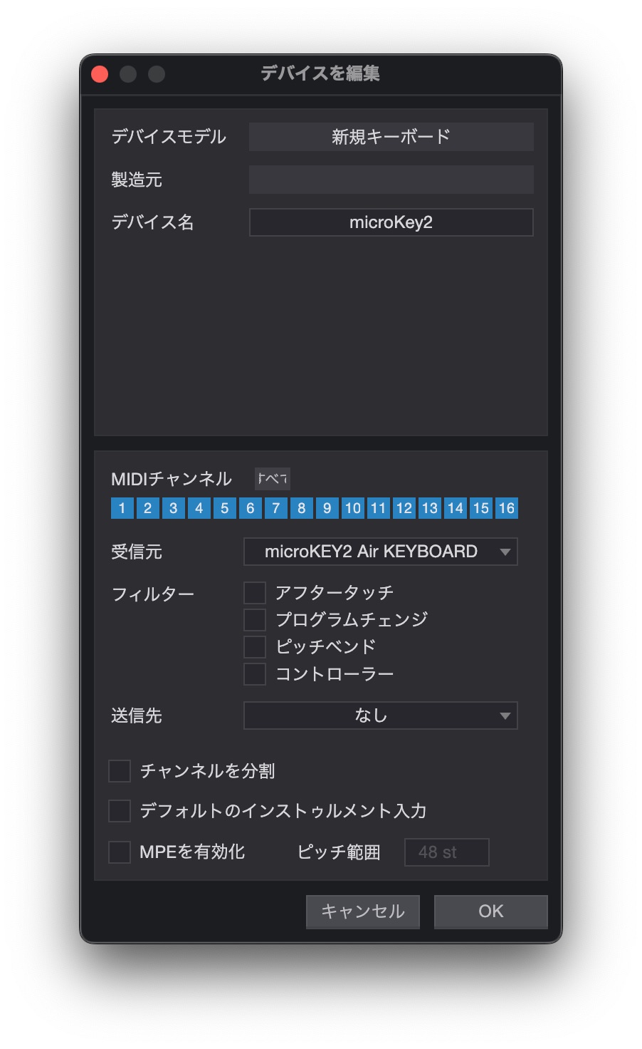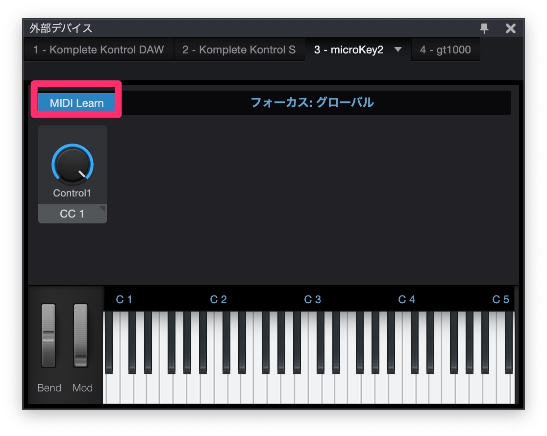 「microKEY Air」を選択すると外部デバイスの画面が開きます。