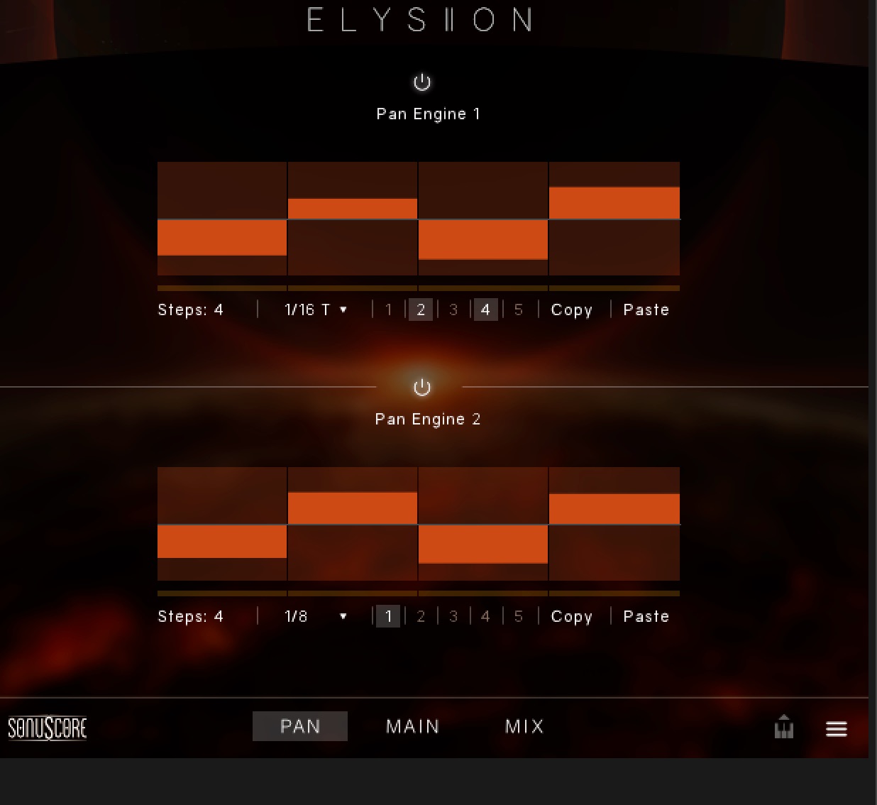 1〜5個のどのインストゥルメントにPanエンジンを適応させるか決めて鳴らせます。