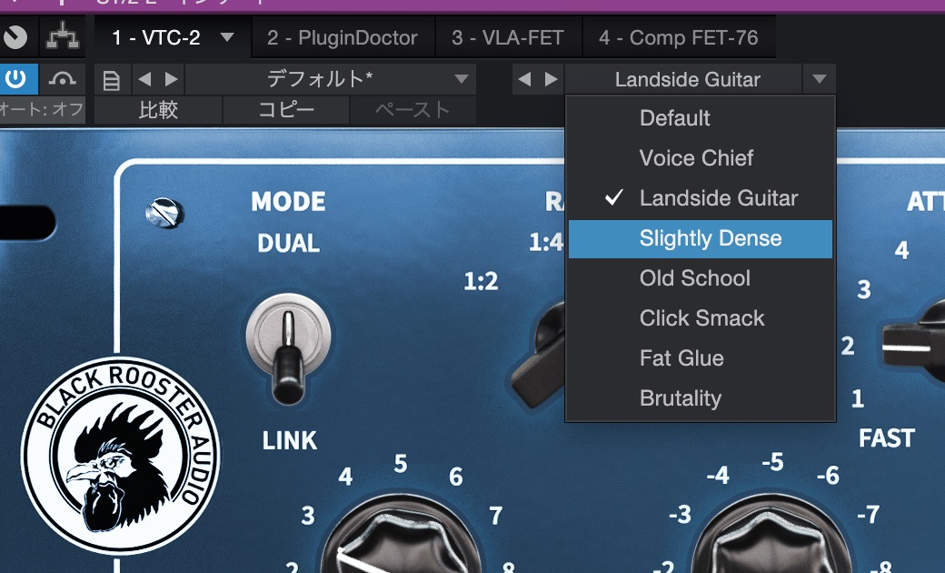 「 VTC-2 」はBlack Rooster Audio(BRAプラグイン)によるコンプレッサー。