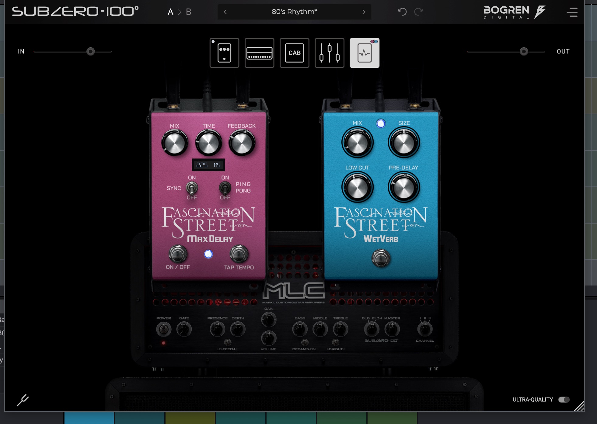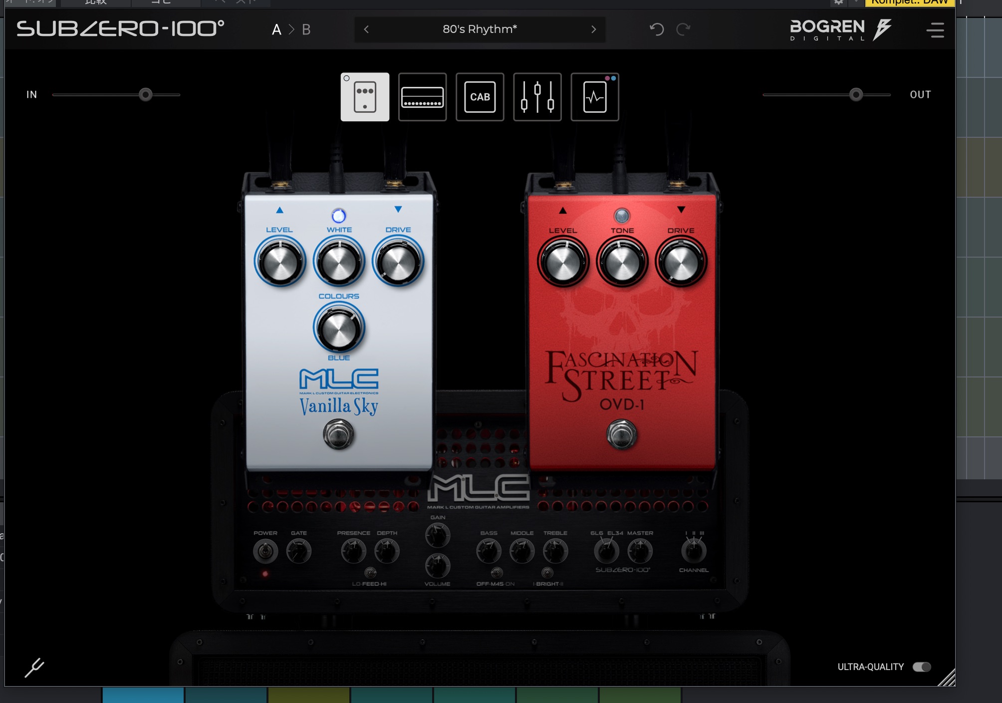 - アンプのエフェクトループには、2つの異なるオーバードライブペダル、MLC Vanilla SkyとJens Bogrenのクラシックなグリーンオーバードライブペダルのモデルがあります。Jens Bogrenは数々のレコードで使用されたものです。