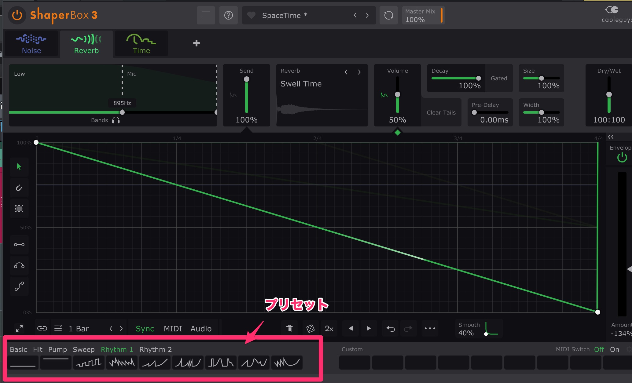 リバーブを常にかけているだけならReverbShaperでなく普段のリバーブでも良いわけですが、自由にそしてリズミカルにリバーブを適応できるのがこのReverbShaperの特徴です。