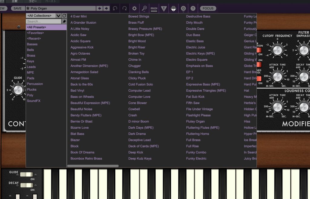 250以上のファクトリープリセットパッチ、ポリフォニックモード:1、2、4、8、または16ボイス、MPE互換コントローラー、オーバーサンプリングと現代的な仕様になっているソフトシンセです。