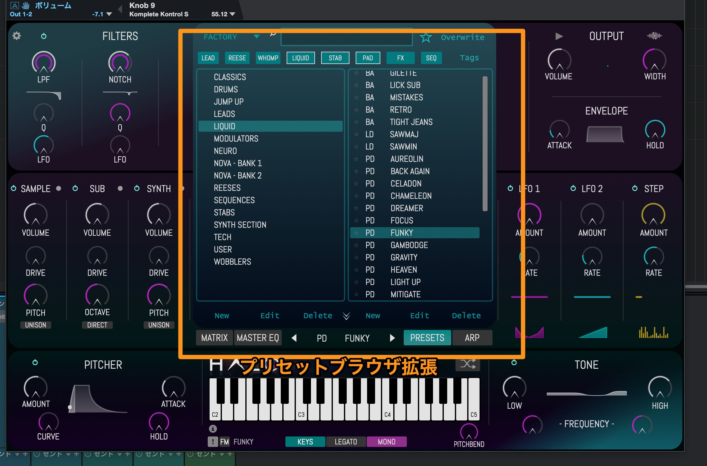 しかしちょっとわかりにくいですが、プリセットブラウザのみ拡張表示ができるようになっています。