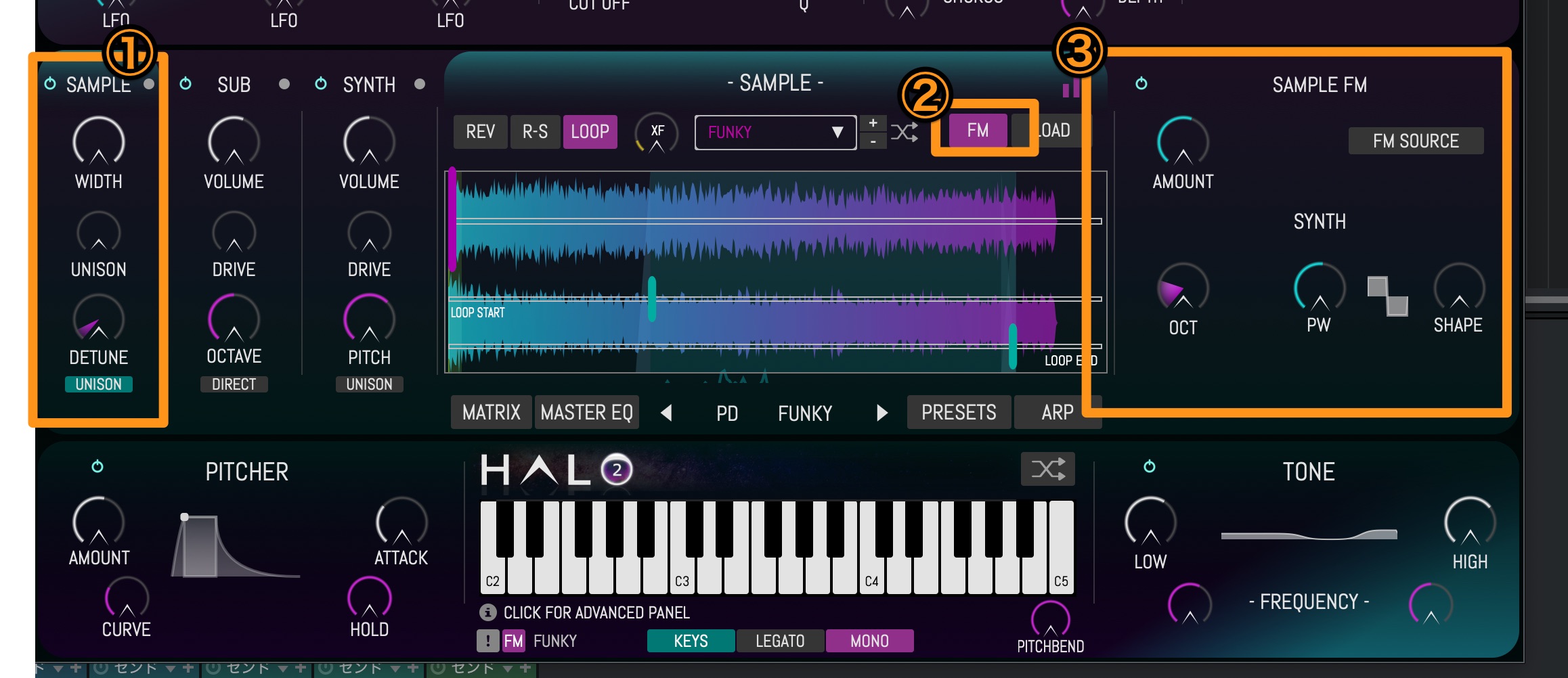 HALOからアップグレードしHALO-2へ進化。サンプラーFMエンジンの機能が付きサンプルバンクを変調できるようになりました。