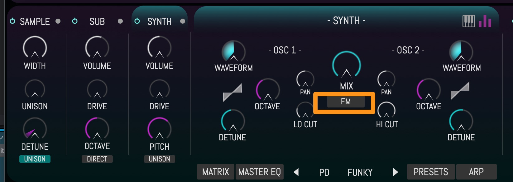 ロンプラとシンセにはそれぞれFMボタンが用意されていて、音を変化させていくことができます。
