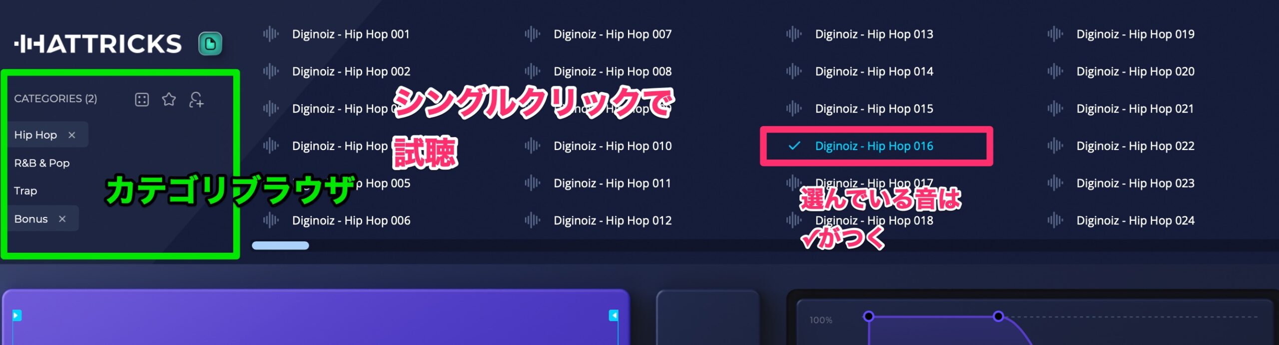 Hattricksはピッチ変更もできるし、収録されているハイハット素材の種類が853あり、色々な組み合わせが試せます。