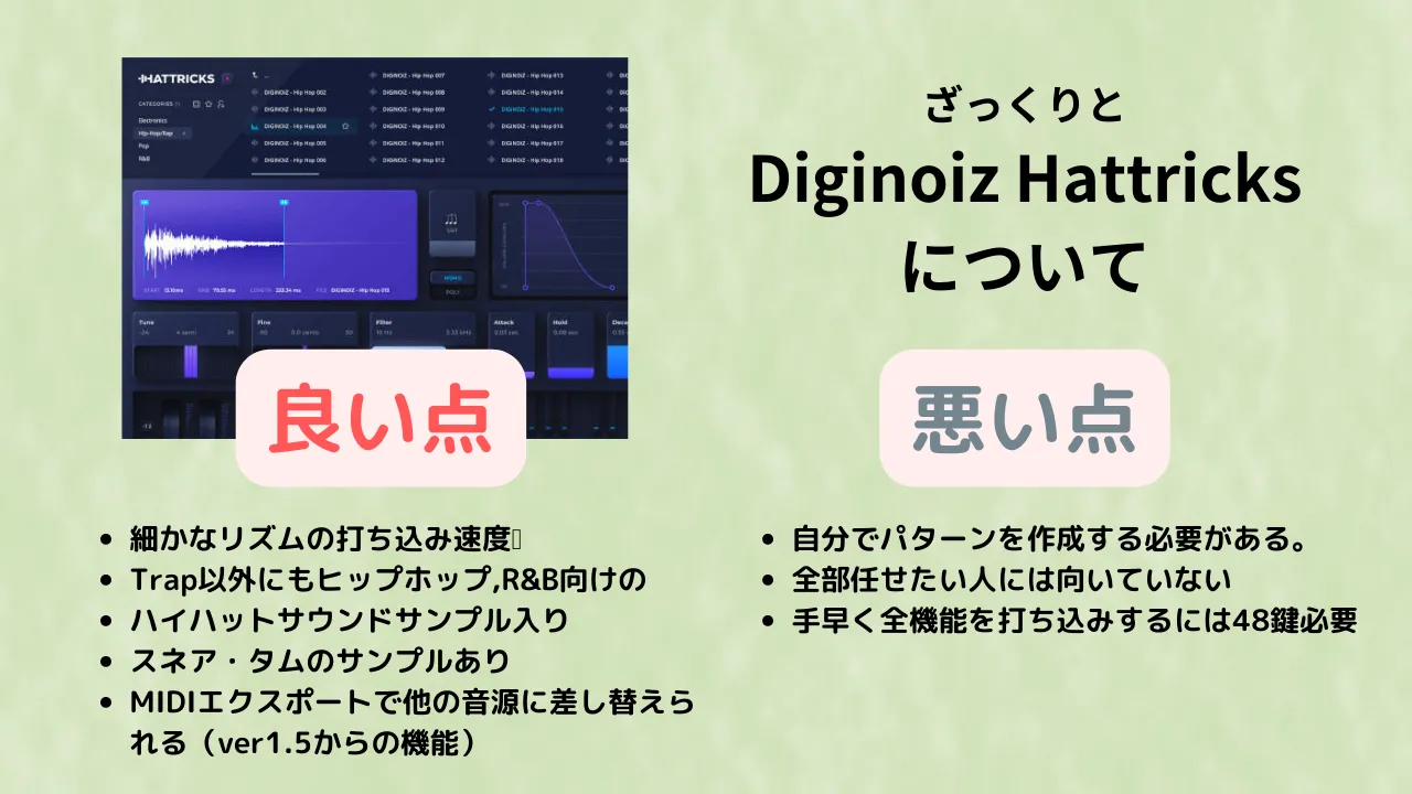 ボカロPのピノキオピーの曲である「神っぽいな」の1:38~以降で聞けるハイハット音が連打する音は「Diginoiz Hattricks」だそうです。
