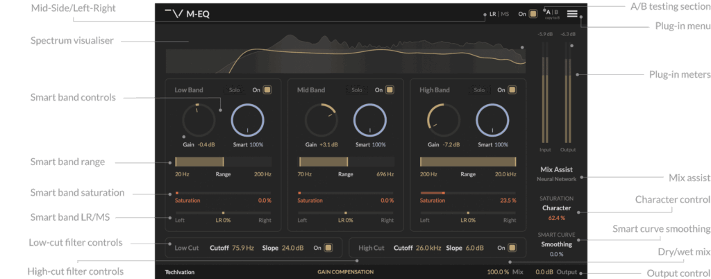 そんなEQ処理の常識を覆すプラグインとして登場したのが、Techivationの「M-EQ」です。このプラグインの最大の特徴は、ユーザーが細かく周波数を探る必要がない点にあります。「Smart Curves(スマート・カーブ)」と呼ばれる独自のAIアシスト技術が、入力されたオーディオ信号をリアルタイムで分析し、最適なEQカーブを自動で生成してくれるのです。それはまるで、熟練のエンジニアが隣に座って、つまみを調整してくれるかのような感覚。ここでは、M-EQがなぜ次世代のスタンダードとなり得るのか、その革新的な機能について詳しく解説します。