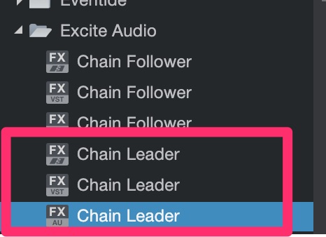 同じエフェクトチェーンを使いたいトラックに「Chain Follower」を挿します。