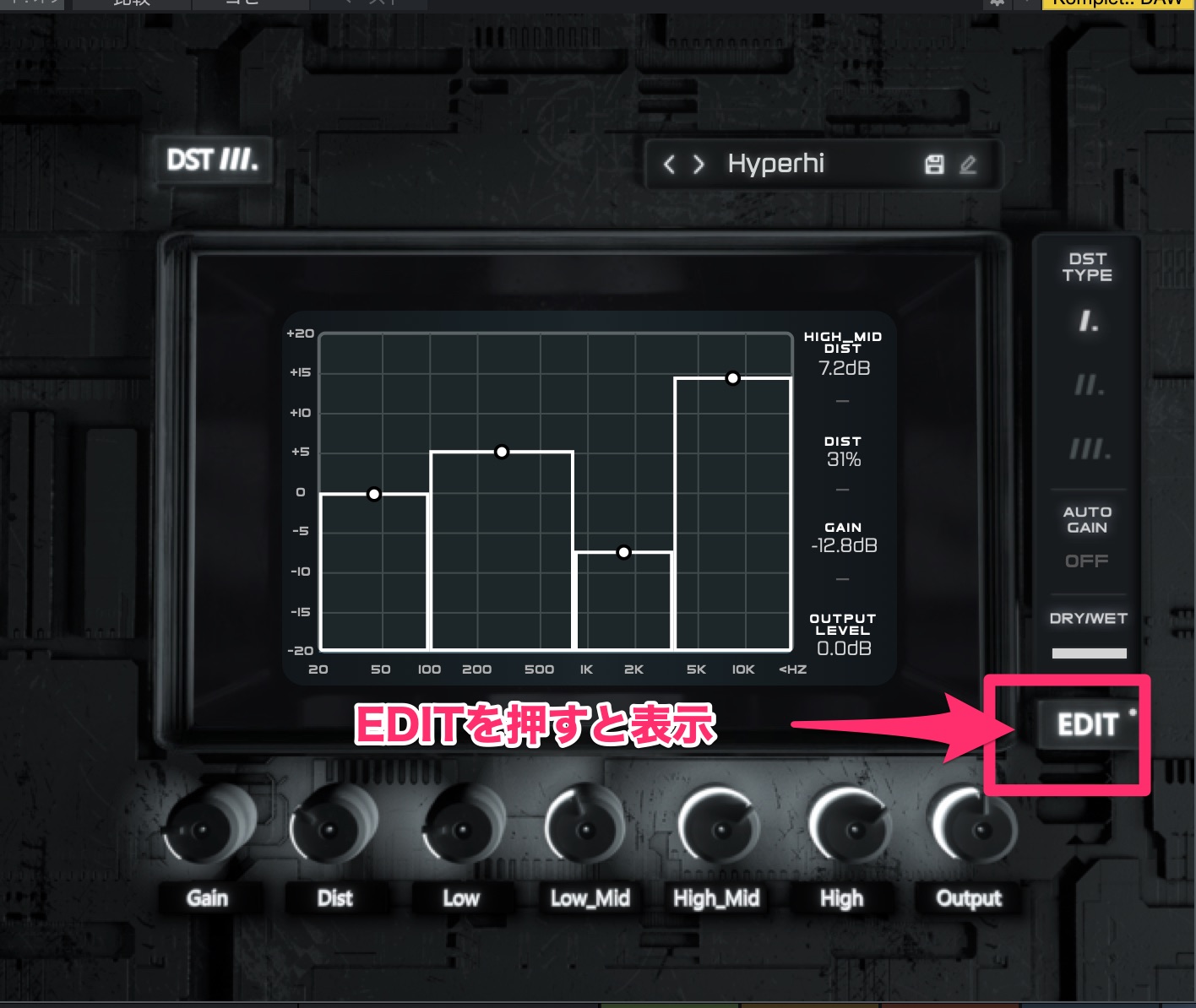 EDIT画面で細かい帯域調整もできるのですが、Low,Low Mid,High Mid,Highのつまみを回していくと音の特性が変わっていくのはギターアンプのEQを回しているようで設定のわかりやすさとやりやすさを感じました。