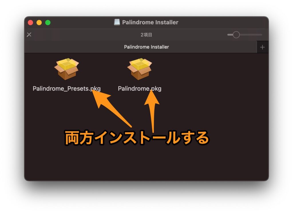 Macの場合にはPALINDROME_INSTALLERSフォルダの中にあるdmgを使ってインストールを行います。