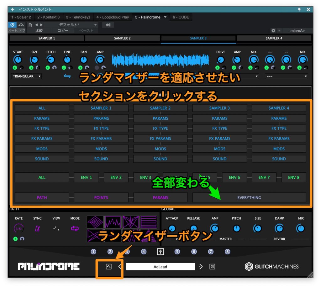 通常のサンプラーですとKontaktのように楽器のサンプリングした音を鳴らすものから、リズムのワンショットをサンプリングしてドラムマシンのようにつかっていくものが多いのですがこのPALINDROMEは電子音楽制作や実験的なサウンドデザインを目的としたサンプラー。