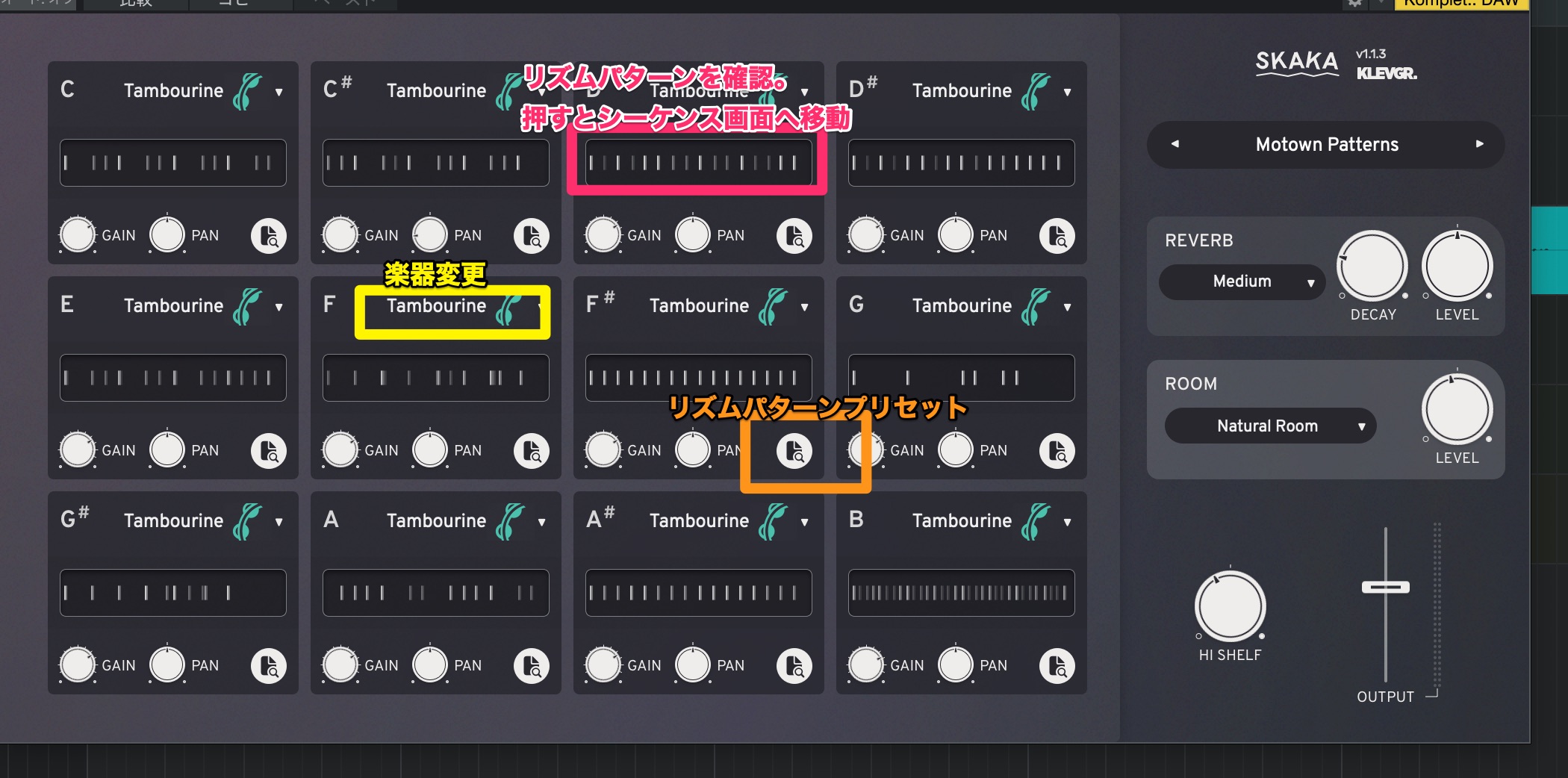 極端な設定で12スロットすべてタンバリンにして個別にピッチを変えたり、フィルターを入れてパターンを組み合わせるといった贅沢な使い方もできます。