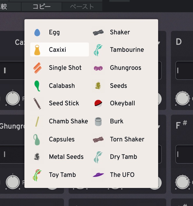 合計18種類のシェイカー楽器を12個のスロットに当てはめて鳴らせるパーカッション音源です。