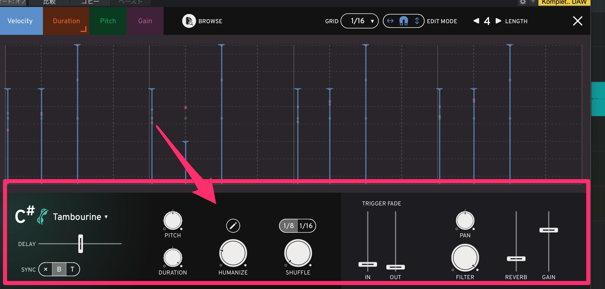 (Velocity,Duration,Pitch,Gain)の値がマークされていて他のタブでも設定値が見えるようになっています。