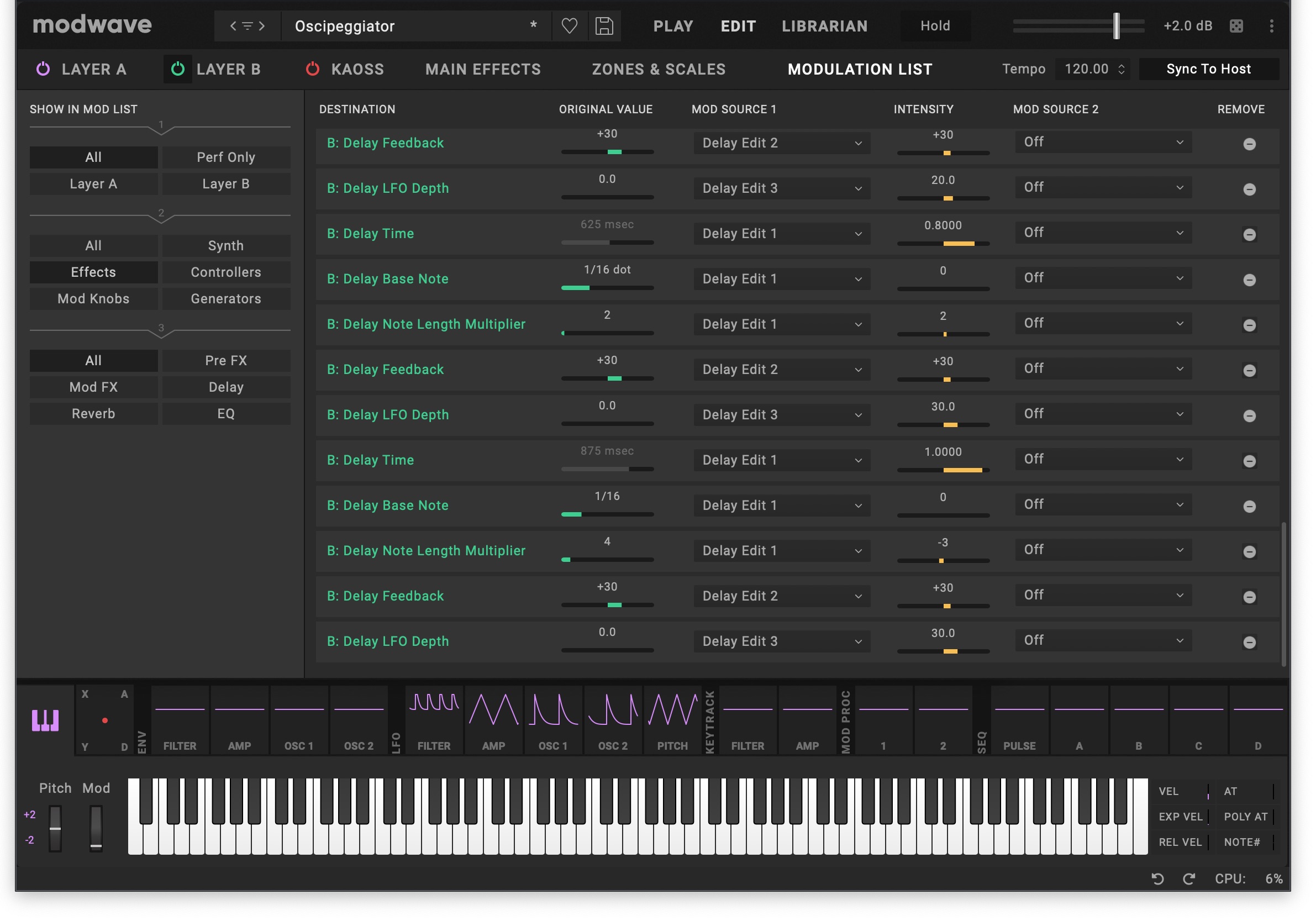 モジュレーションリストは非常に細かく設定できるので繊細な音の変化ができます。