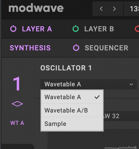 Wavetable A ,Wavetable A/B , Sampleの3パターン音素材を設定できます。