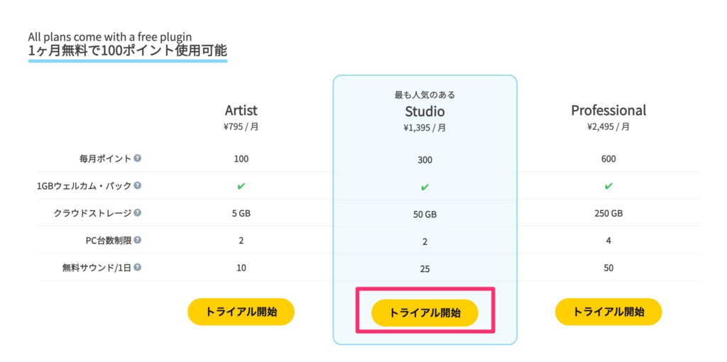 一番人気のプランはStudioで、サウンド素材の使用数やストレージ量がちょうど良いですね。