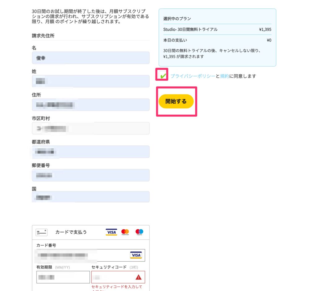 ・請求先住所と支払い方法を入力し、プライバシーポリシーと規約に同意しますにチェックを入れたら