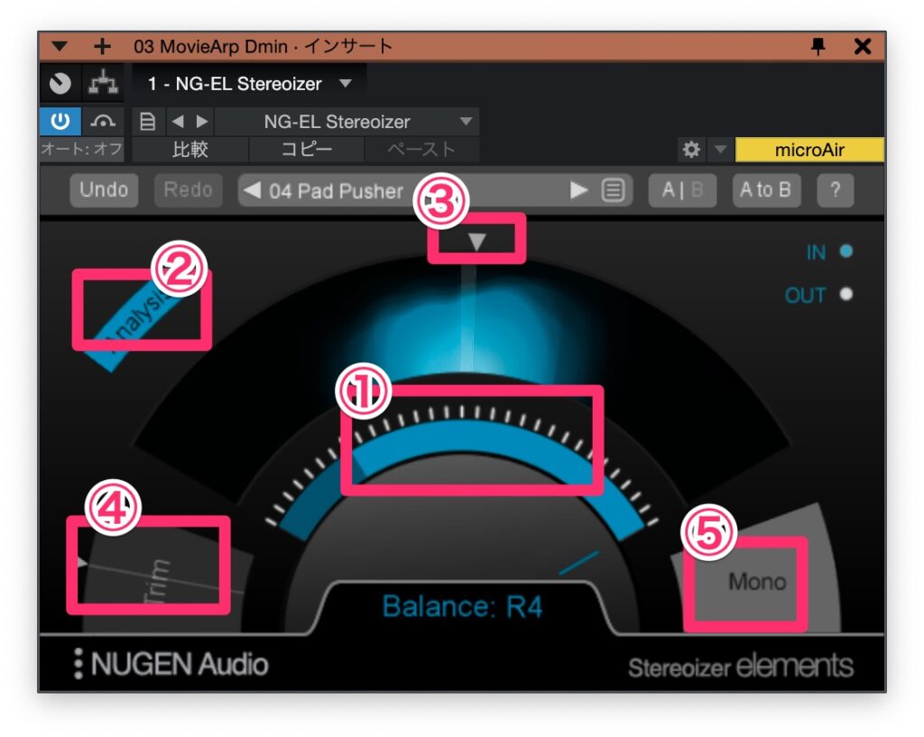 ステレオの広がり方を視覚的に見たい場合にはAnalysisボタンをオンにします。