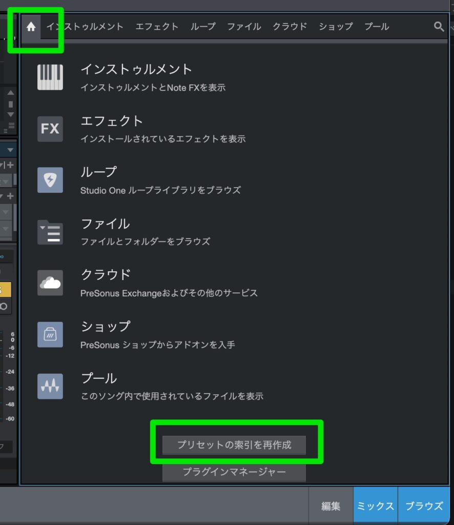 Studio Oneのブラウザメニューを開いて「家のアイコン」を押します。