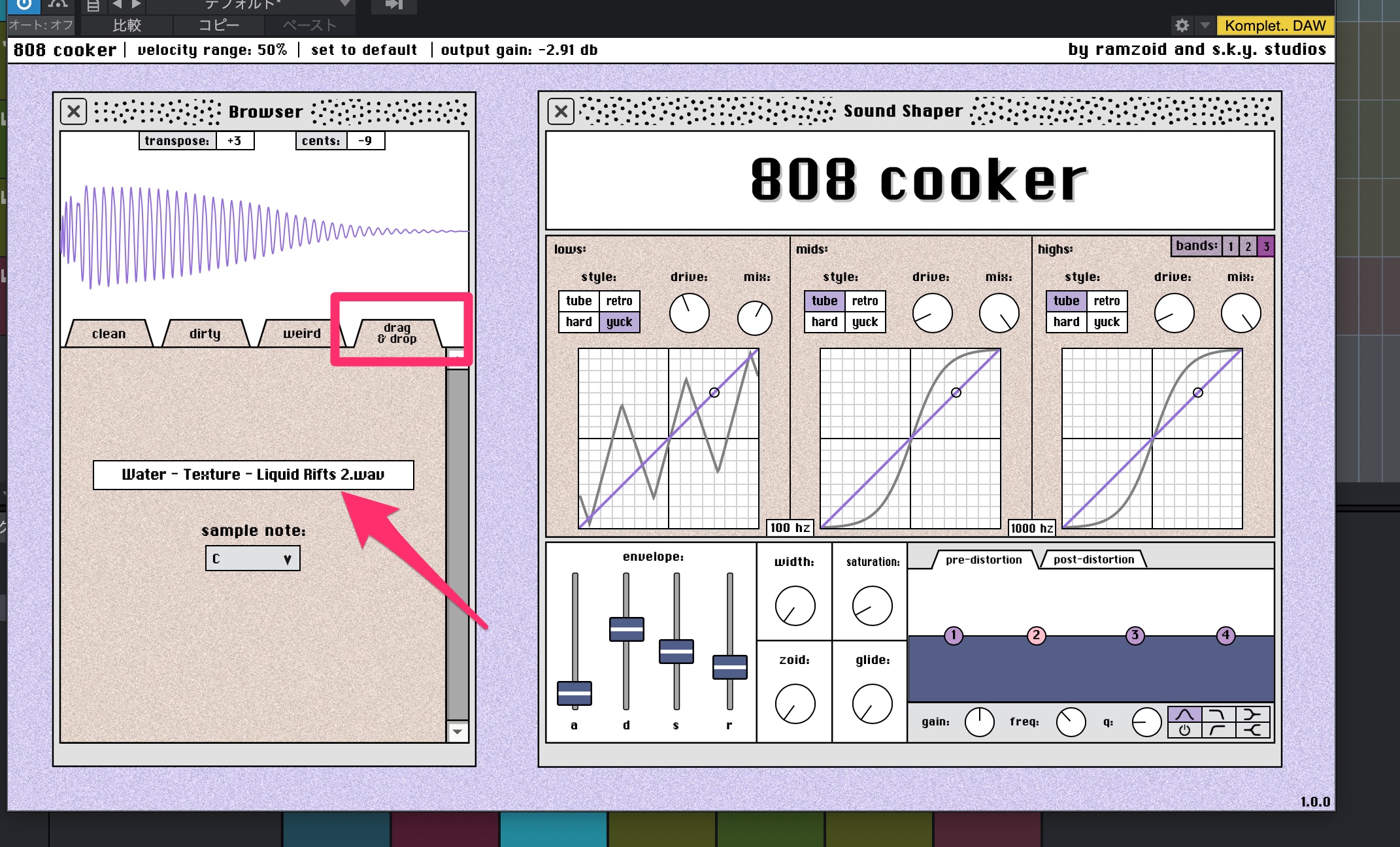 手持ちのサンプルを読み込ませて「808 Cooker」でディストーションをかけることもできます。