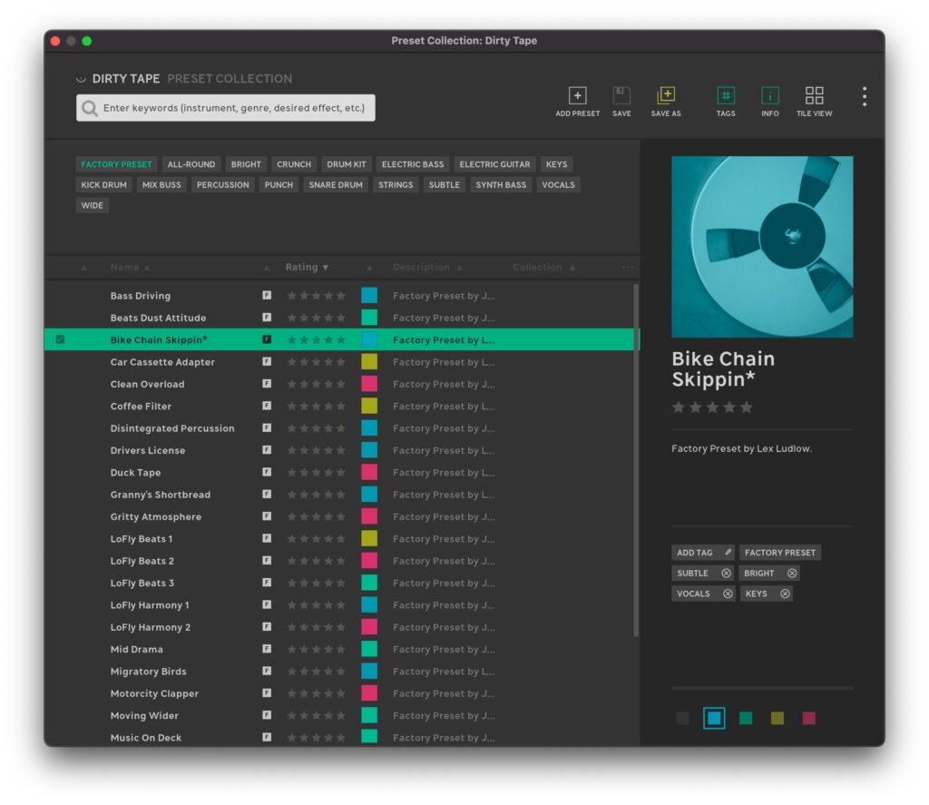 スウェーデンのディストーションマスターと評価の高いTape、Tape Echoes、Harmonics、SaturationKnobプラグインのメーカーからDirtyTapeが登場します。降りて汚れて音質を野蛮に保ちたいときに必要なテープエフェクト。ダーティテープは、トラックにロードした瞬間から、温かみのあるアナログな雰囲気を与えます。激しくザラザラしたディストーションとサチュレーションが可能なDirtyTapeは、サウンドに微妙な質感と動きを加えることもできます。トラックの写真フィルターのように、Dirty Tapeを使用すると、静的で鈍い状態から、生き生きとしたカラフルな状態にすばやく移行できます。