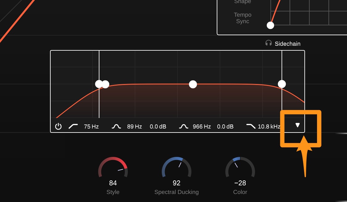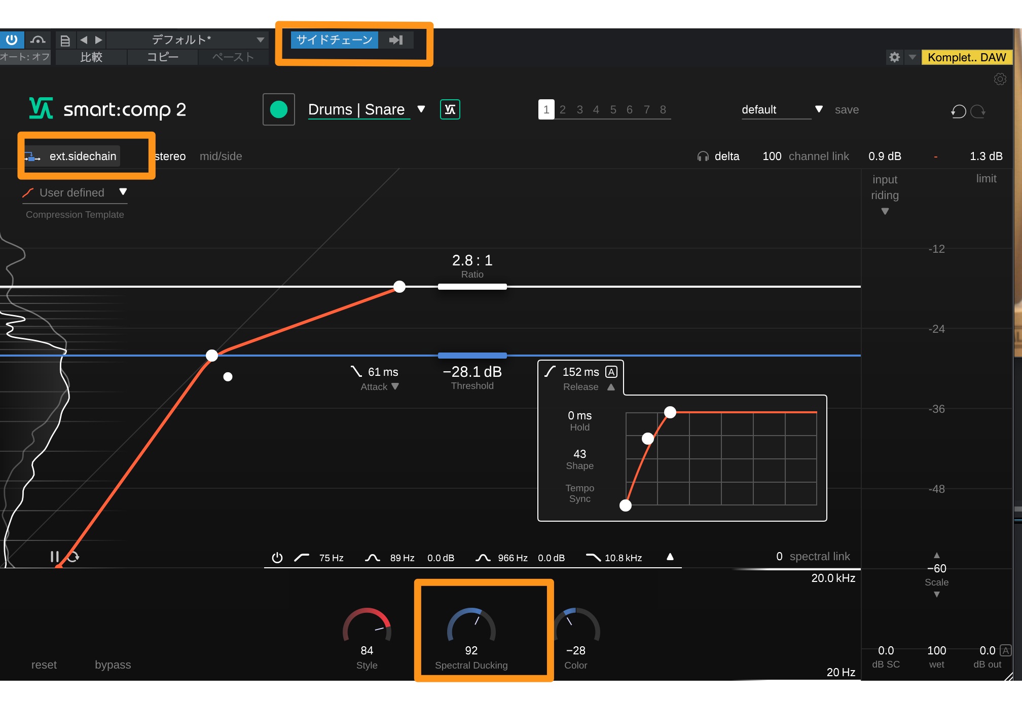 サイドチェインの入力元を設置後、「ext.sidechine」のボタンを押すと、下のパラメーターが「Sectral Ducking」へ変化し設定できます。