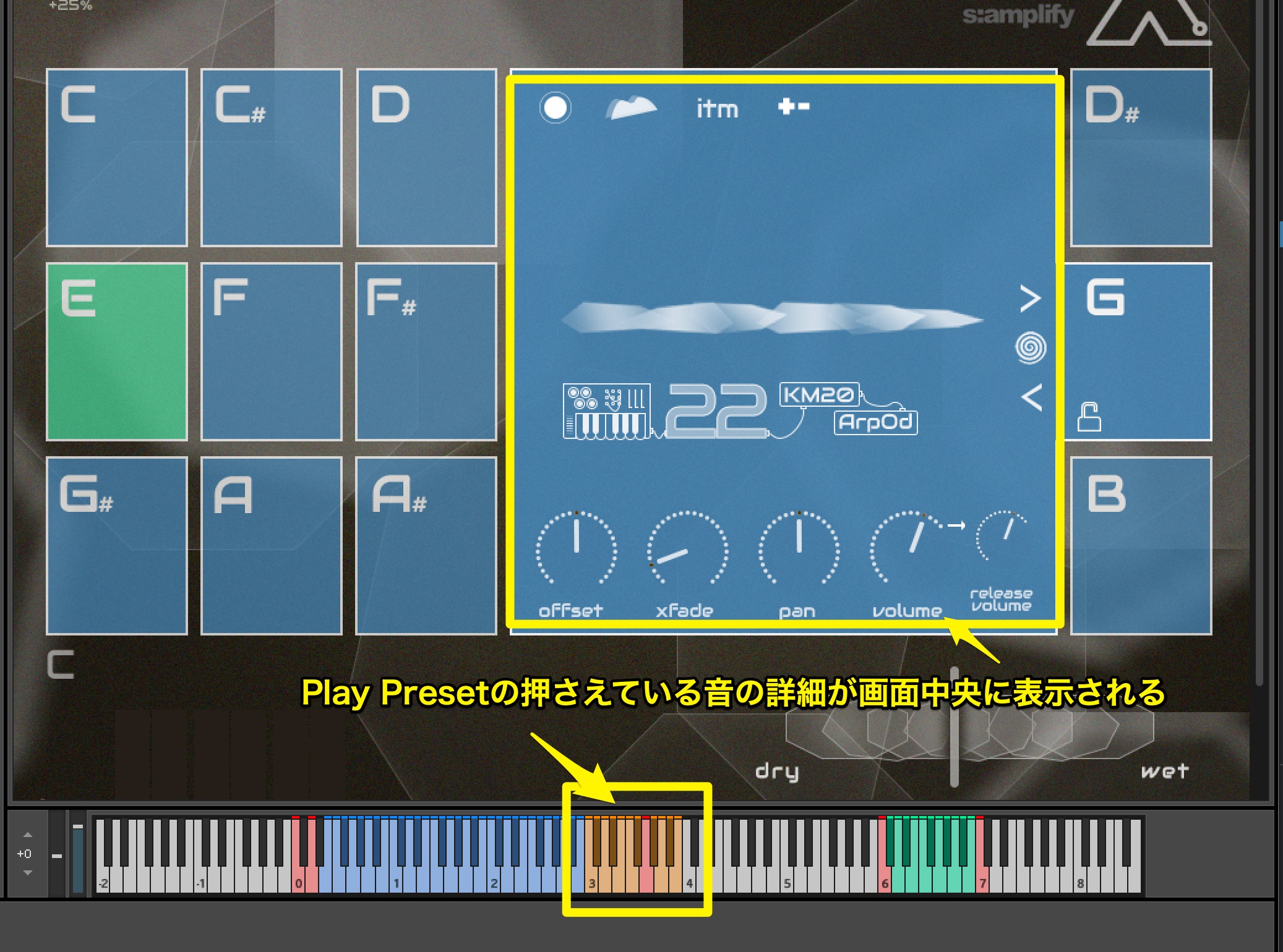 Play Presetの押さえている音の詳細が画面中央に表示されます。