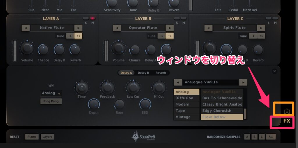 ピアノディレイはDelayA、DelayBの2タイプがありDelayの名前をクリックすることで切り替えができます。