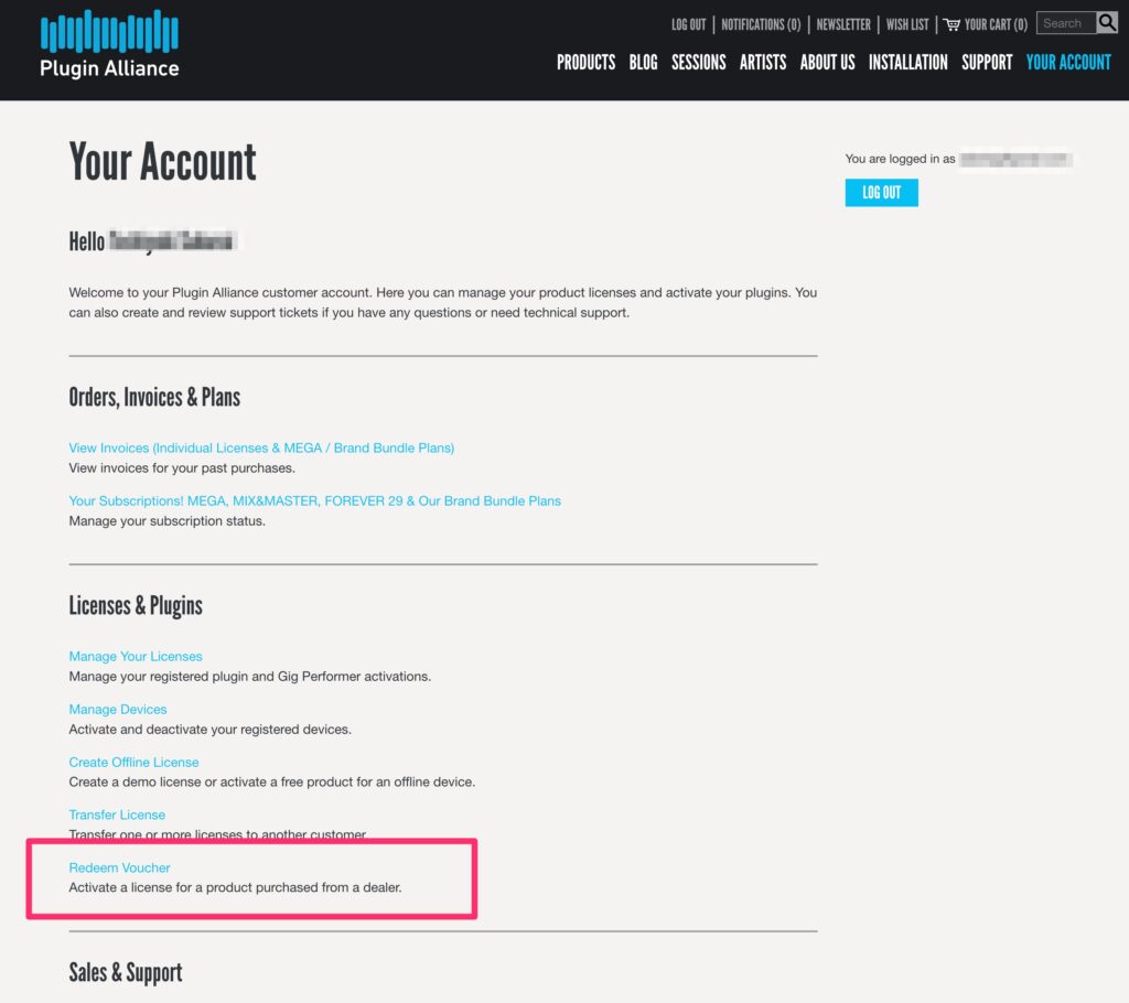 Plugin Allianceのアカウントを作成後ログインし、Your Accountのページを表示させます。