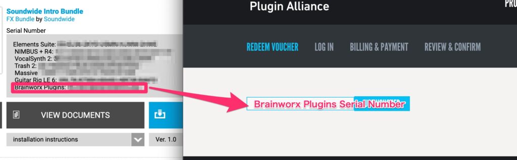 Soundwide Intro Bundle購入後手に入る「Brainwork Pluginsのシリアルナンバー」を入力欄へ入れます。