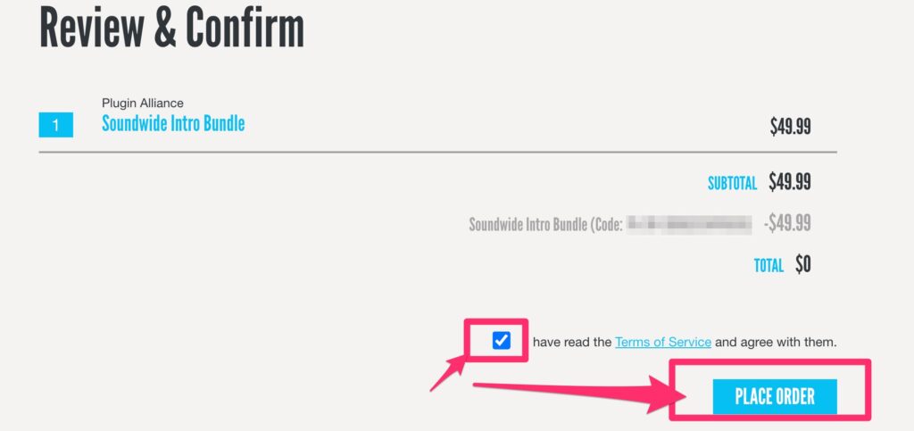 Terms of Serviceのチェックボックスにチェックを入れて「PLACE ORDER」を押します。