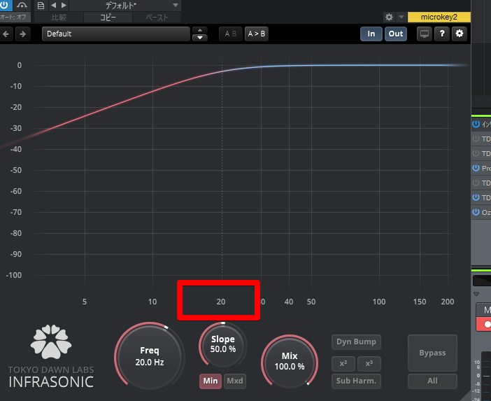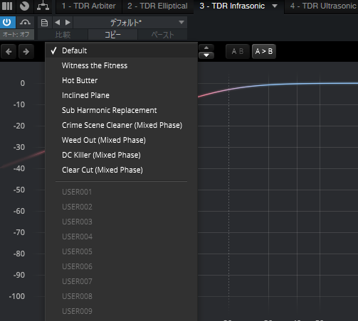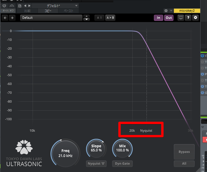 通常のEQだと20KHzまでしか表示されていませんが、TDR Ultrasonicでは20~30KHzの間をスロープをつけてカット処理できます。