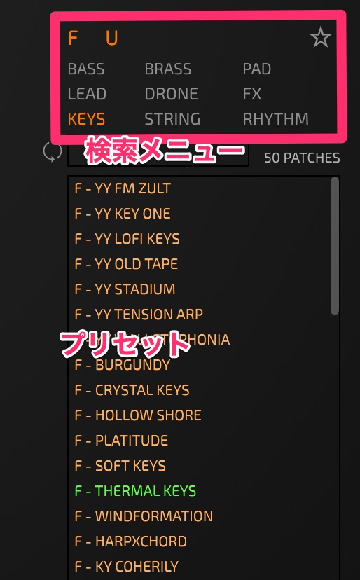 (カテゴリーの種類: BASS / BRASS / PAD / LEAD / DRONE / FX / KEYS / STRING/ RHYTHM )