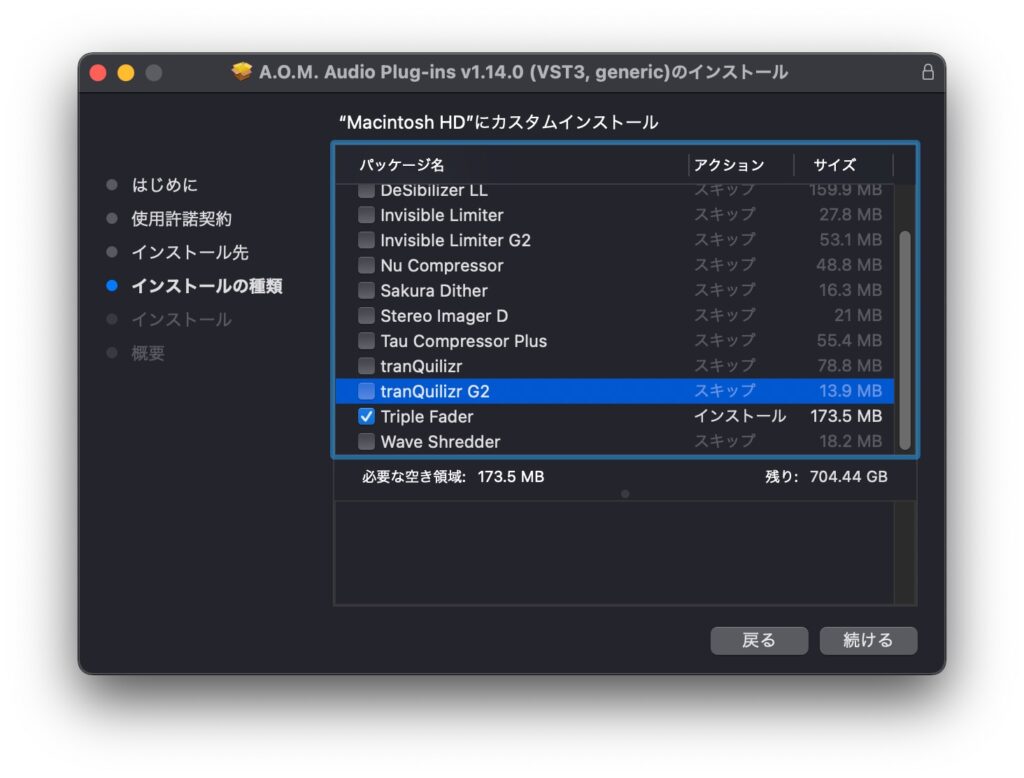 Triple Faderだけをインストールする場合には、インストーラー画面でTriple Fader以外のチェックを外します。