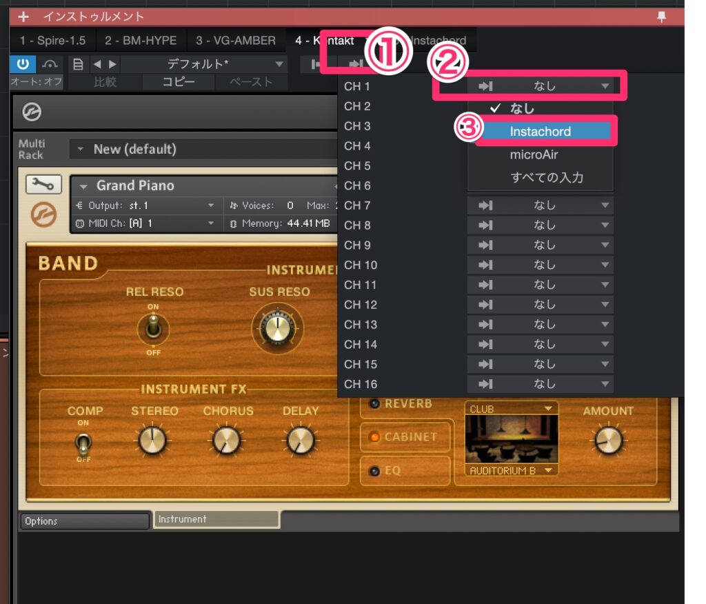 InstaChordのMIDIをどの楽器を鳴らすのか?は自分で決める必要があり、手持ちのピアノ音源やシンセを用意します。