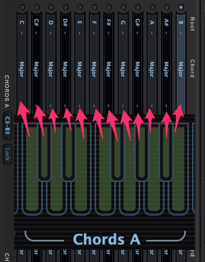 ChordA,ChordBの合計26鍵盤にどのコードを鳴らすのか?を設定し、