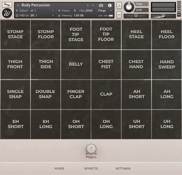 「Body Percussion」は実際に人が手を叩いたり、床を踏んだりしたときになる音をサンプリングしたパーカッション音源です。