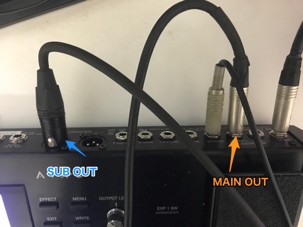 GT-1000のピュアな音を活かしたいなら「SUB OUT」をPA卓へ送っておき、「MAIN OUT」はギターアンプにつないで