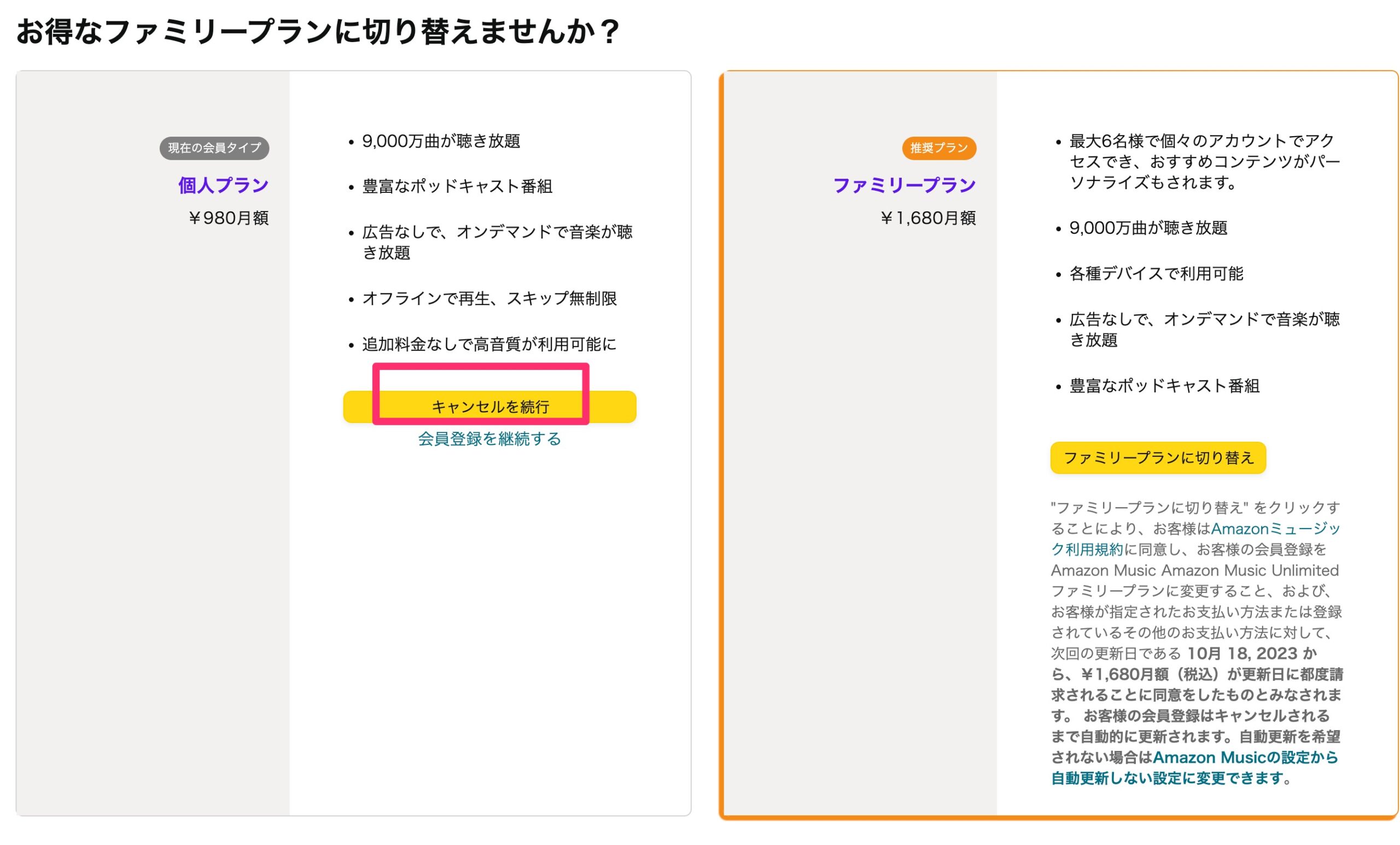 選んでいるプランのボタン下にある「キャンセルを続行」を選択。