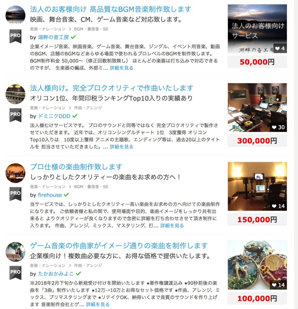 カテゴリの中に「音楽・ナレーション」という枠があり、楽器演奏・作曲・アレンジ・ミックスなど音楽のお仕事依頼が上がっています。