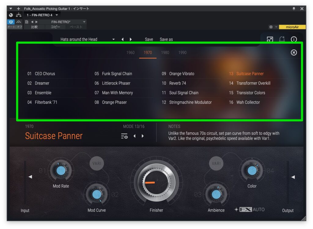 エフェクトを選ぶブラウザでは、1960,1970,1980,1990と年代別に分けられたタブ表示がとてもわかりやすくマウスで瞬時にエフェクトを切り替えられます。