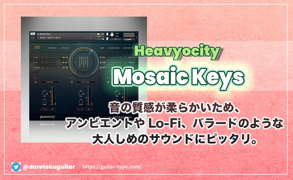Heavyocity Mosaic Keys レビュー!音の質感が柔らかいため、アンビエントやLo-Fi、バラードのような大人しめのサウンドにピッタリ。